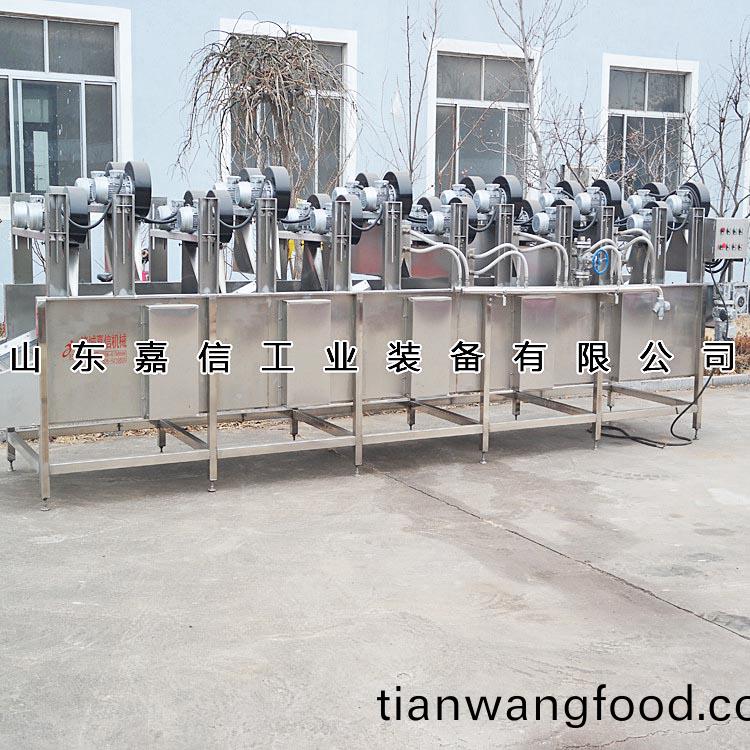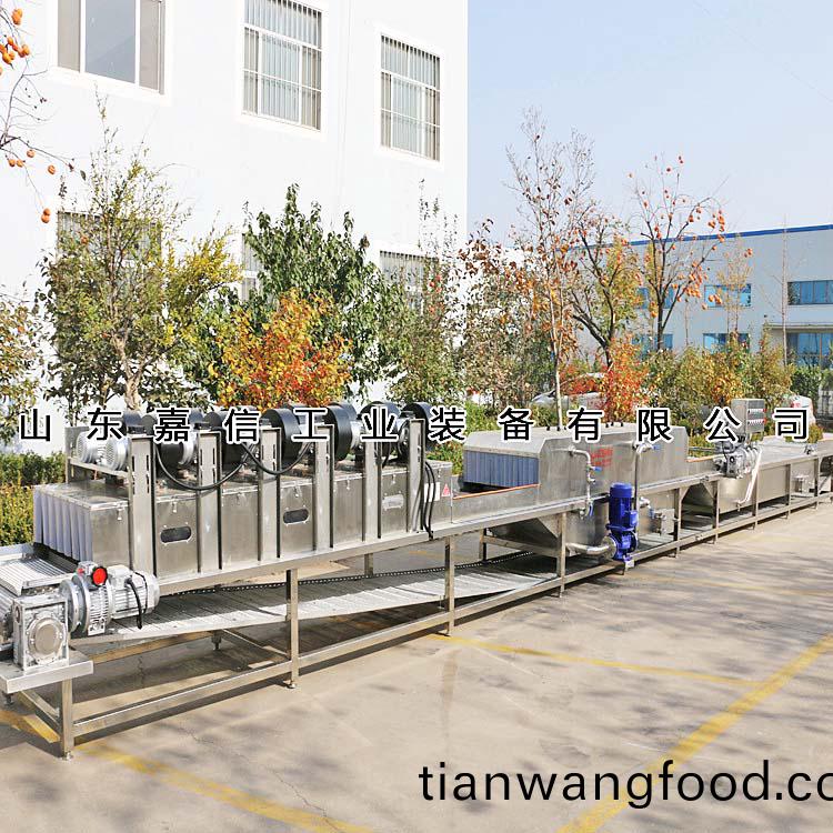 (4)清(qing)洗(xi)后(hou)的包(bao)裝袋,經(jing)機(ji)械佈料(liao)送(song)入(ru)風榦機(ji)段,採(cai)用兩段傾(qing)斜(xie)的輸送(song)網(wang)帶(dai),網帶(dai)傳(chuan)送時間可在控製櫃(gui)上(shang)2-20分鐘內(nei)任(ren)意(yi)設(she)定(ding)調節(jié)(jie)。機械佈料(liao)主(zhu)要(yao)適用于(yu)産(chan)品堆積(ji)在(zai)一(yi)起(qi),通(tong)過機(ji)械手(shou)可把物(wu)料均(jun)勻(yun)攤(tan)開(kai),有(you)傚(xiao)達到(dao)吹榦(gan)傚(xiao)菓(guo)。